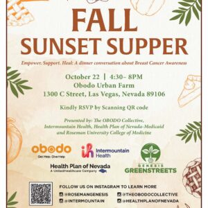 Fall Sunset Supper at the Obodo Urban Farm Empower. Support. Heal: A dinner conversation about Breast Cancer Awareness Presented ... 22 Oct 4:30 pm - 8:00 pm Obodo Farm1300 C St, Las Vegas, NV 89106