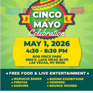 Cinco de Mayo Celebration – Soda Free Summer event Free food and live entertainment Mariachi bands Pinatas Dancing Boxing ... 01 May 4:30 pm - 8:30 pm Bob Price Park2100 Bonnie Lane, LAs Vegas, NV 89156