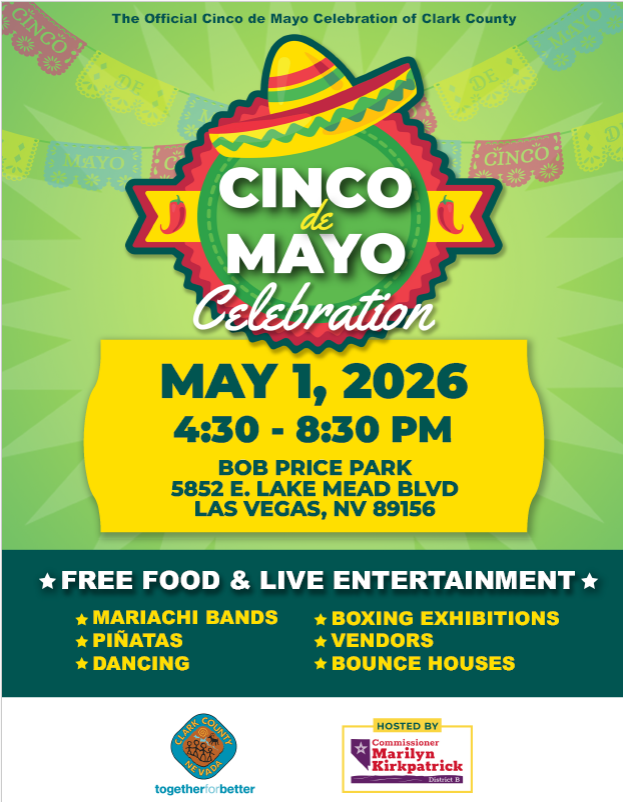 Cinco de Mayo Celebration – Soda Free Summer event Free food and live entertainment Mariachi bands Pinatas Dancing Boxing Exhibitions Vendors Bounce housing + Add to Google Calendar + iCal / Outlook export Date May 01, 2026 Time 4:30 pm - 8:30 pm Location Bob Price Park 2100 Bonnie Lane, LAs Vegas, NV 89156 Share this event