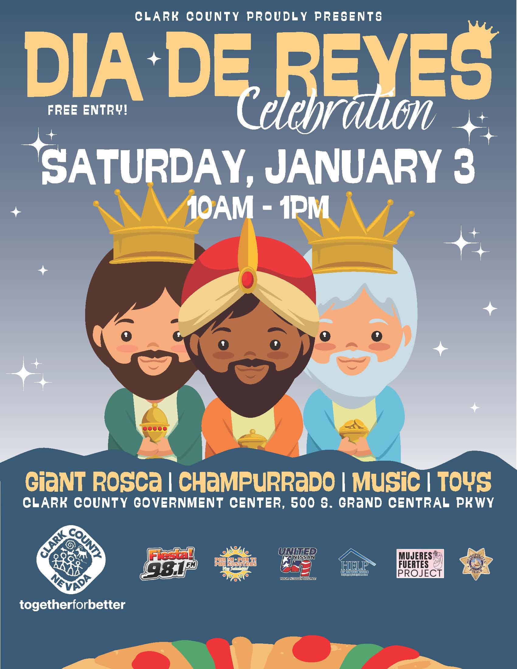 Día De Reyes Celebration, Hosted by Clark County Free Entry Gian Rosca Champurrado Music Toys + Add to Google Calendar + iCal / Outlook export Date January 03, 2026 Time 10:00 am - 1:00 pm Location Clark County Government Center 500 S Grand Central Pkwy Las Vegas, NV 89155 Share this event