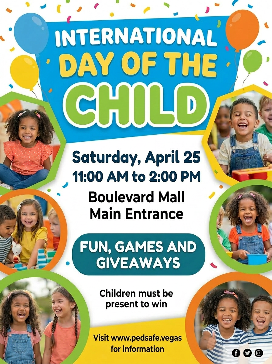 International Day of the Child Fun, Games, and Giveaways! For more info, contact: www.pedsafe.vegas + Add to Google Calendar + iCal / Outlook export Date April 25, 2026 Time 11:00 am - 2:00 pm Location The Boulevard Mall 3528 S. Maryland Pkwy.; Las Vegas 89169 NV Share this event