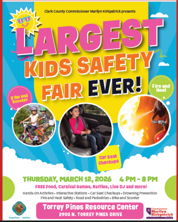 Kids Saftey Fair Presented by Commissioner Kirkpatrick Free Food Carnival games Raffles Live DJ and more! + Add to Google Calendar + iCal / Outlook export Date March 12, 2026 Time 4:00 pm - 8:00 pm Location Torrey Pines Resource Center 2900 N. Torrey Pines Dr., Las Vegas, NV 89108 Share this event